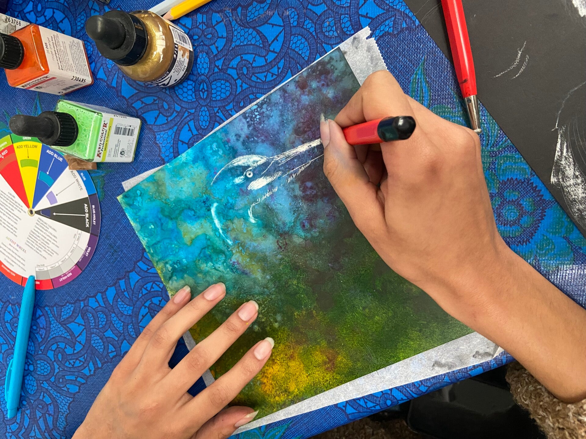 We werken naar een foto van jouw (huis)dier of naar een compositie met bloemen en bladeren en bouwen het werk laagje voor laagje op. Iedere cursist kiest zijn eigen invalshoek uit. Als je een abstract werk wilt maken, is dat ook mogelijk.